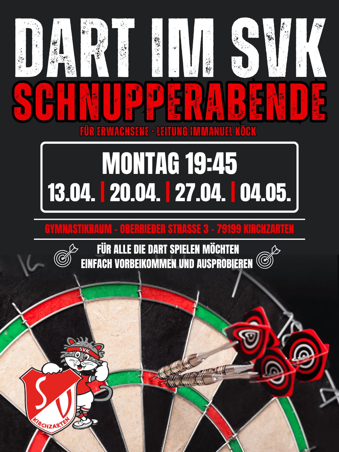 Dart-Schnupperangebot im SVK Du möchtest Dart spielen? Dann komm unverbindlich zu unseren Schnupperabenden im SVK. Leitung: Immanuel Köck Termine: Montags 19:45 Uhr - Gymnastikraum am Sportgelände 13.04. | 20.04. |...